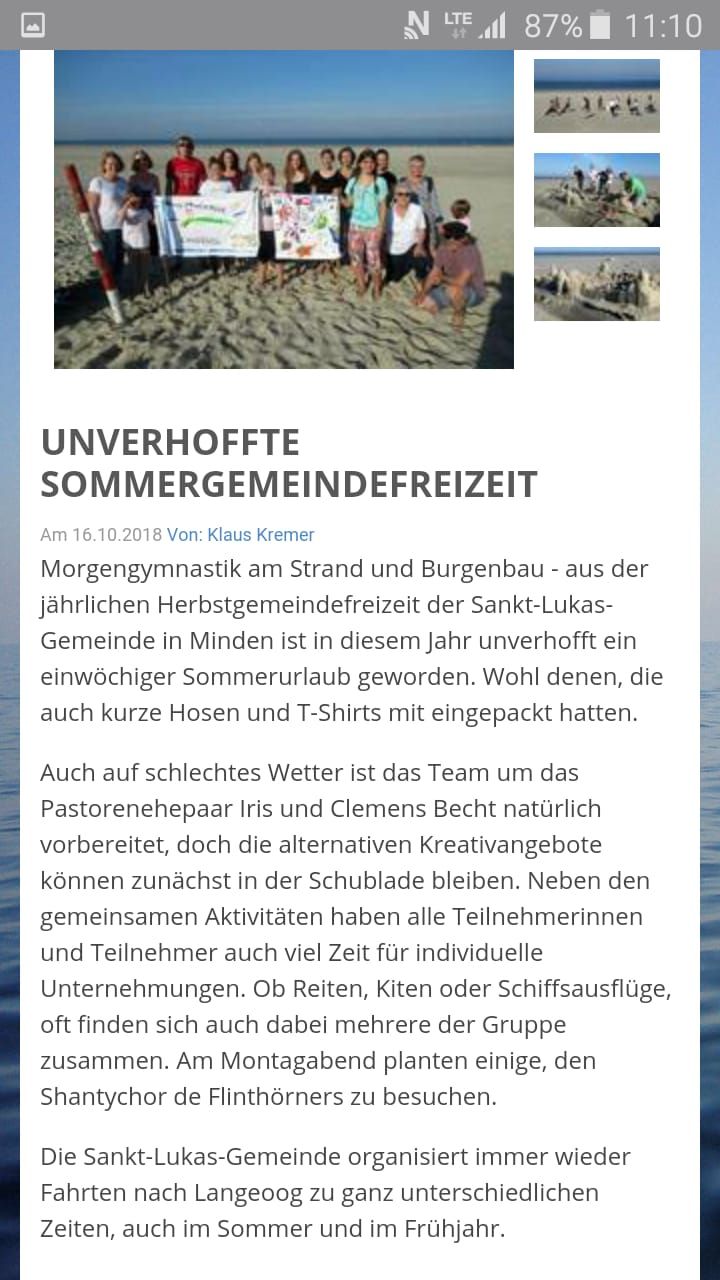 Die Kirchengemeinde St. Lukas aus Minden-Minderheide ist seit vielen Jahren regelmäßig in unterschiedlichen Zusammensetzungen im Haus Mariensee. Im Lauf der Jahre gab es eine Menge netter Erlebnisse auf Langeoog, an die sich alle Mitreisenden gern erinnern. Da die Verfasserin dieser Seiten auf diesen Fahrten dabei war, gibt es zum "Schnuppern" und "Lust machen" Eindrücke von Lukas-Freizeiten. Ganz sicher gibt es viele ähnliche Bilder aus den anderen Gemeinden und in jeder Gemeinde Menschen, die immer wieder kommen.